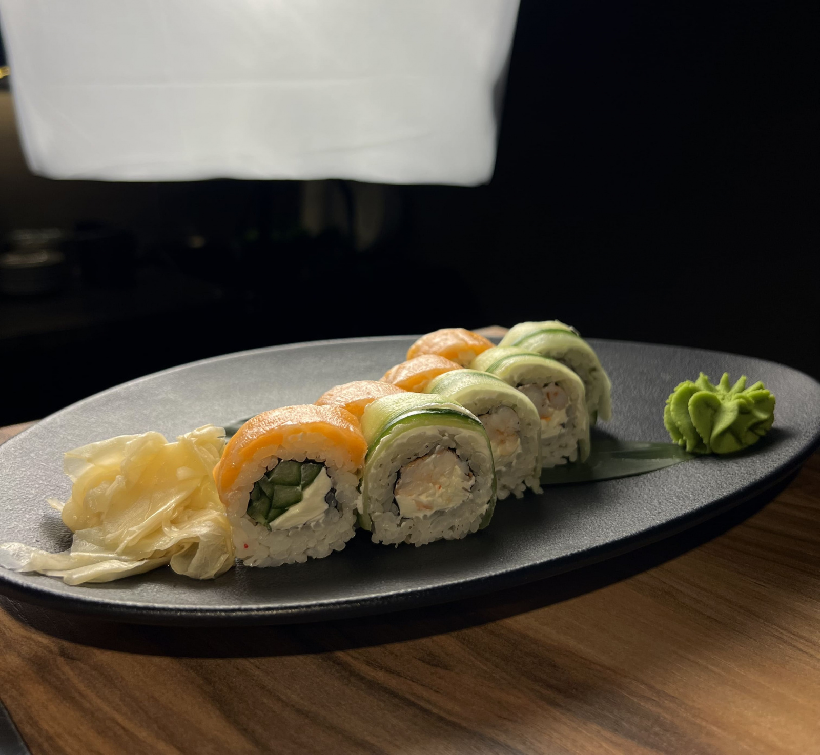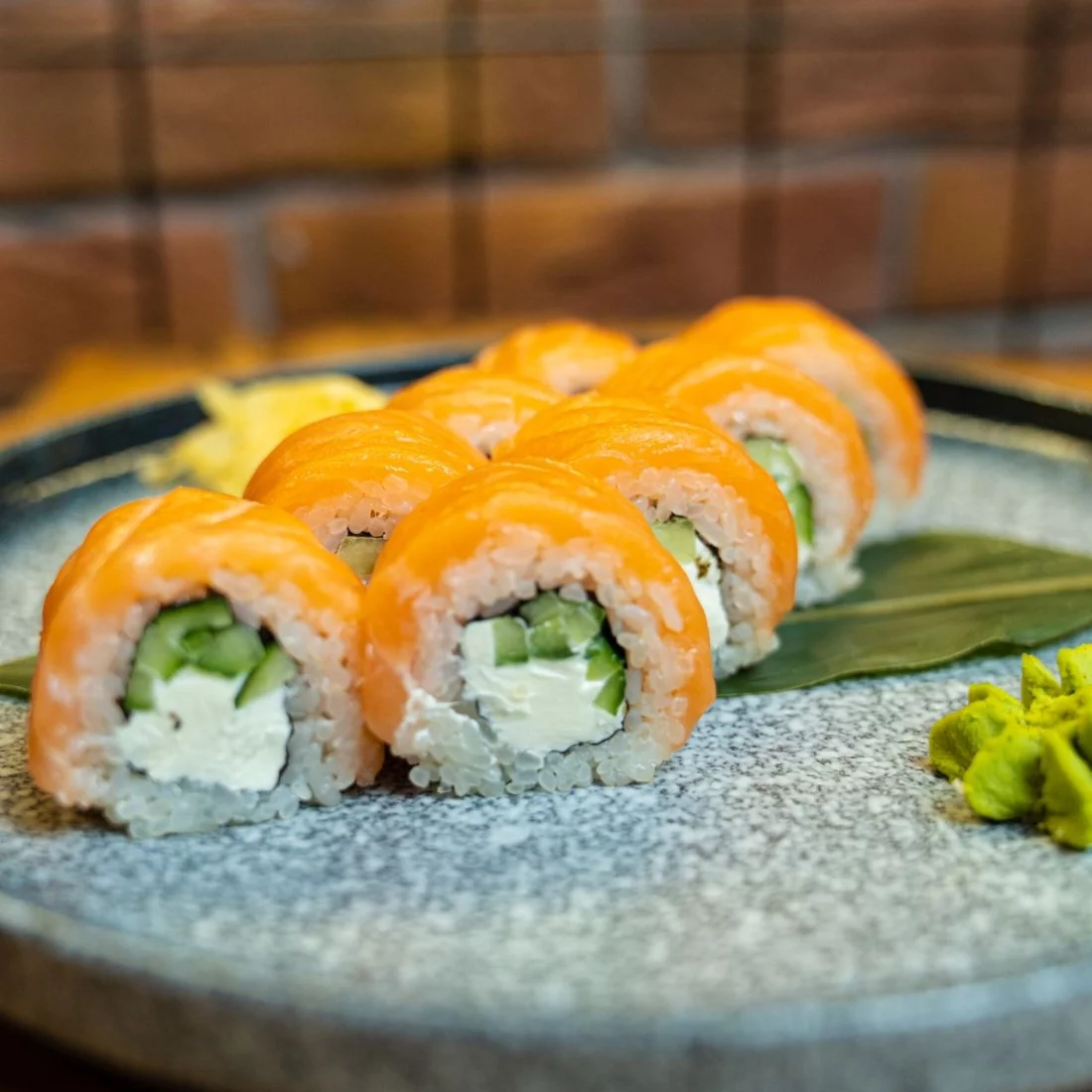 Рис, нори, творожный сыр, огурец, лосось