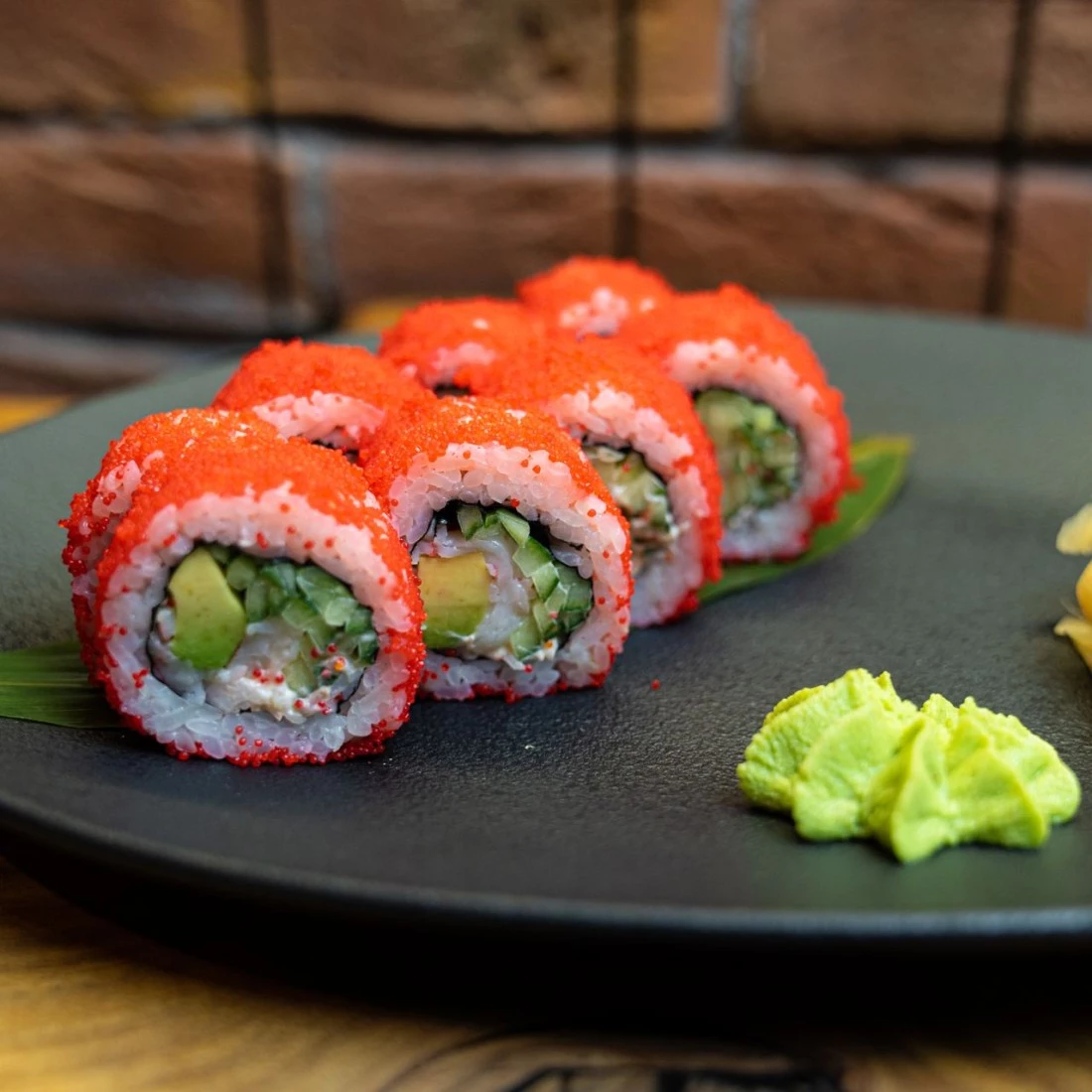 Рис, нори, творожный сыр, краб, огурец, авокадо, масаго