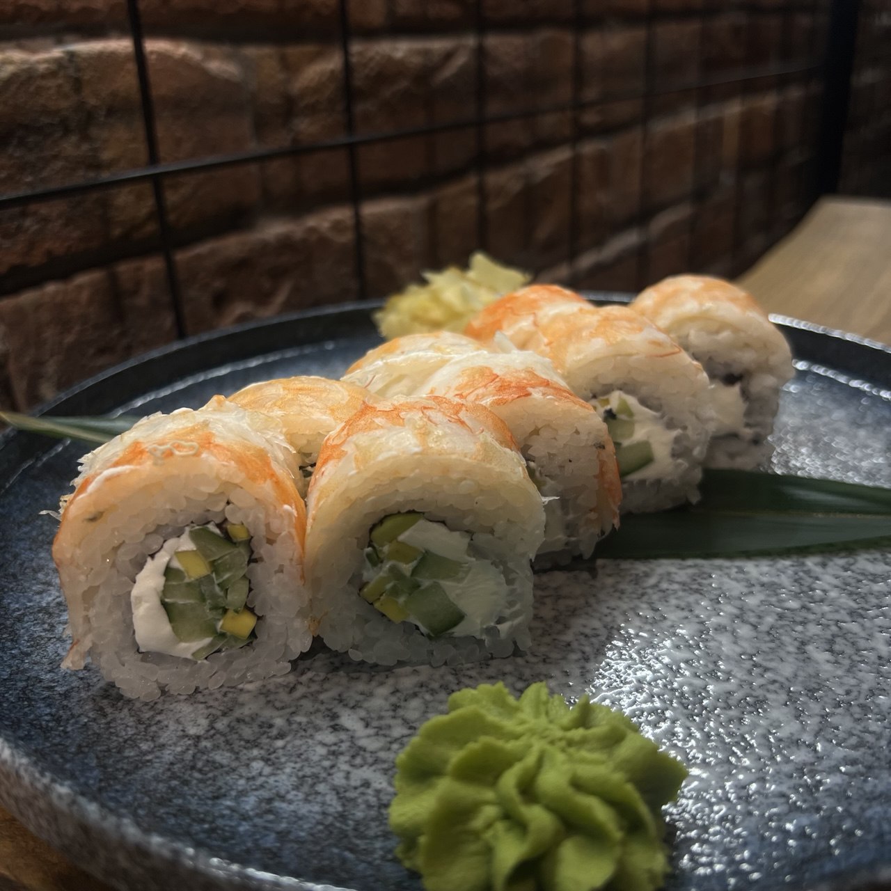 Рис, нори, творожный сыр, огурец, авокадо, креветка