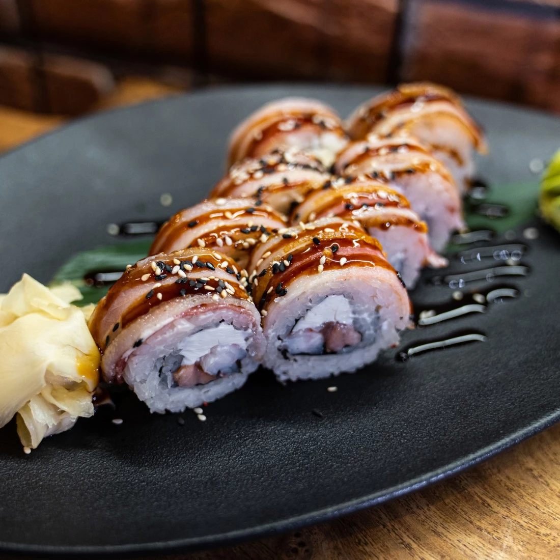 Рис, нори, творожный сыр, креветка, лосось, бекон, унаги, кунжут