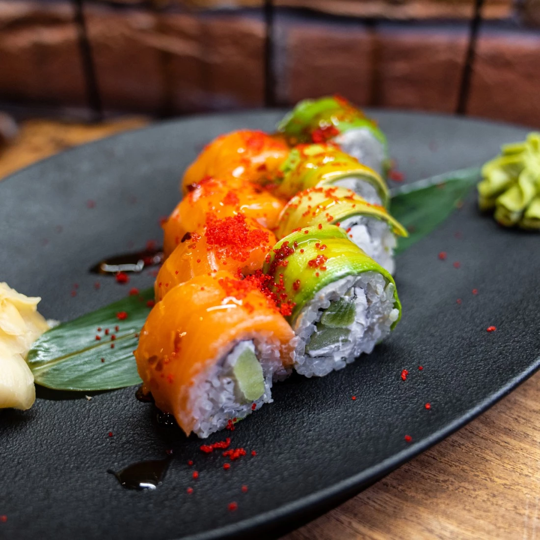 Рис, нори, творожный сыр, киви, лосось, авокадо, тайский чили, масаго красная