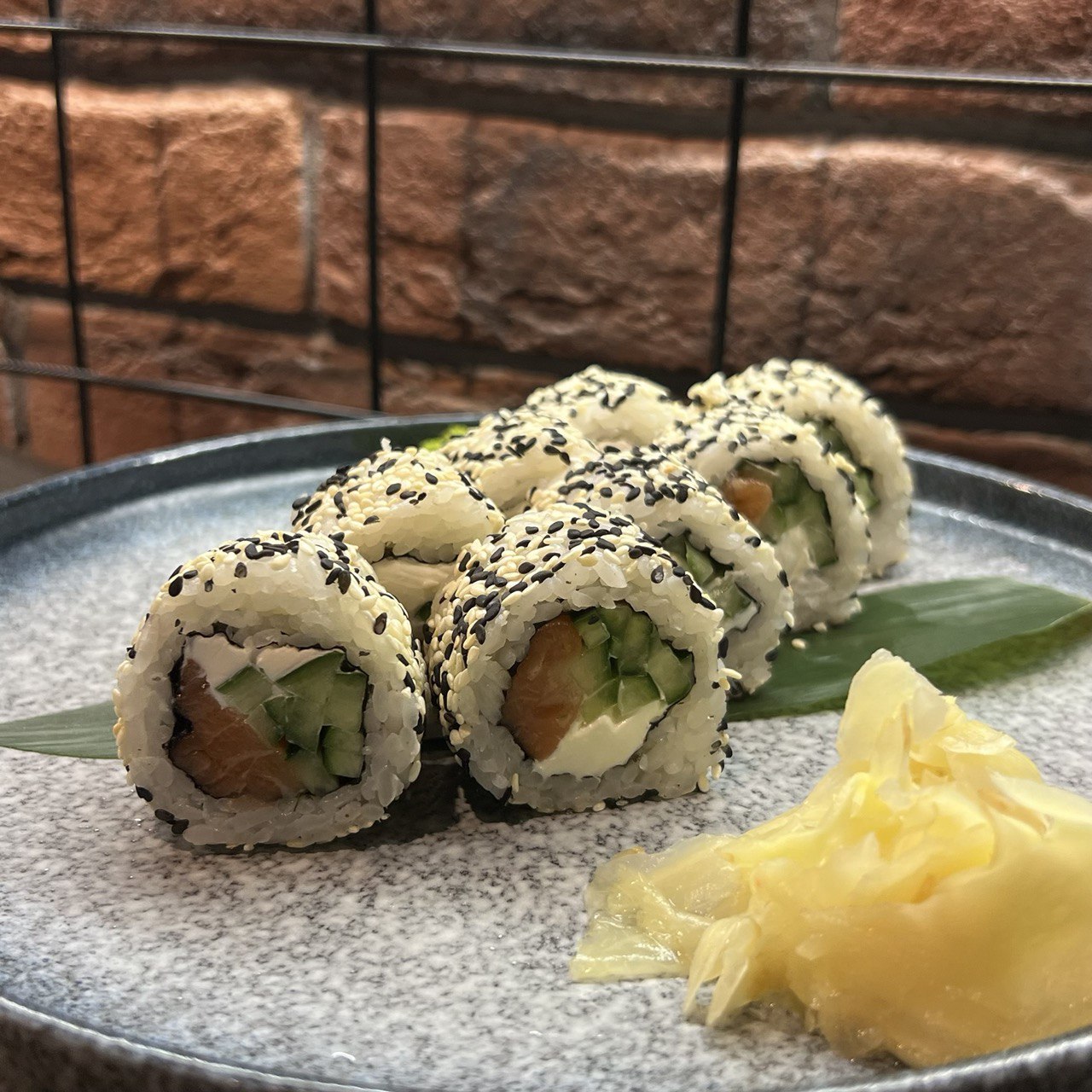 Лосось, огурец, творожный сыр, нори, рис, кунжут