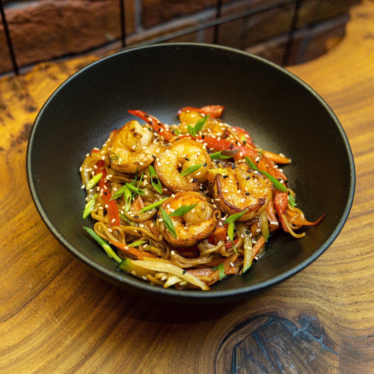 Лапша удон/ рисовая лапша, креветка, пекинская капуста, перец болгарский, морковь, цукини, соус терияки, кунжут, зеленый лук
