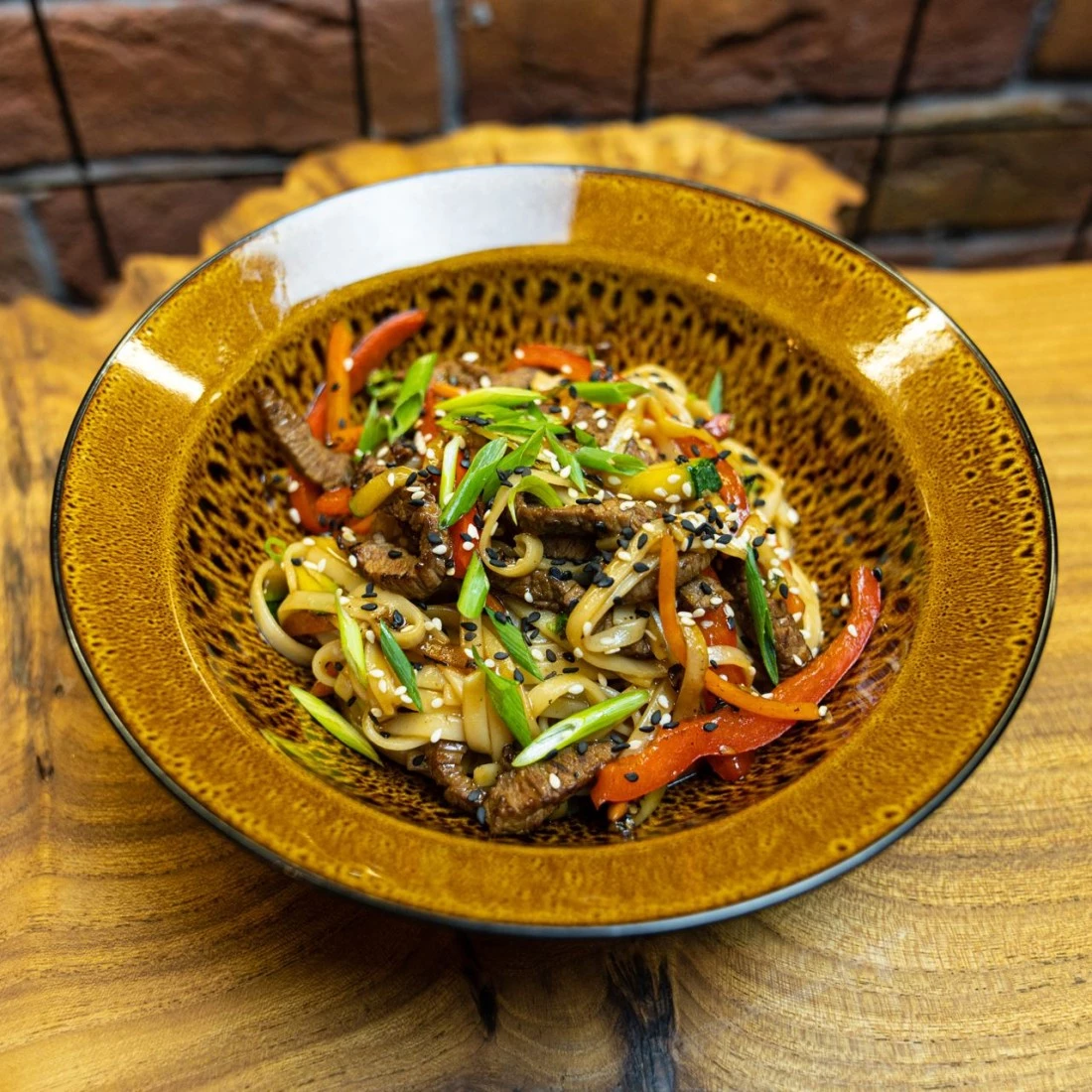 Лапша удон/ рисовая лапша, говядина, пекинская капуста, перец болгарский, морковь, цукини, соус терияки, кунжут, зеленый лук