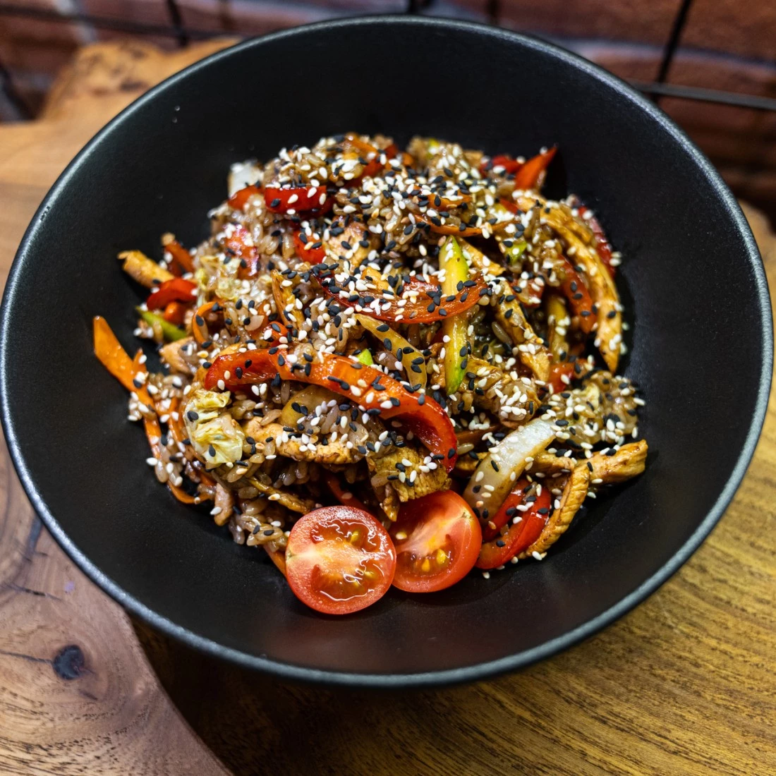 Рис, цыпленок, пекинская капуста, перец болгарский, морковь, цукини, соус терияки, кунжут