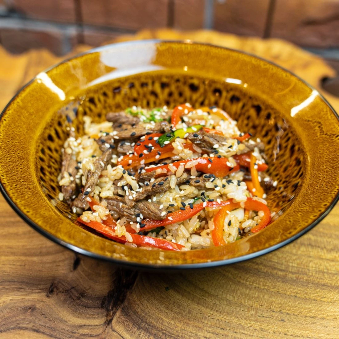 Рис, говядина, пекинская капуста, перец болгарский, морковь, цукини, соус терияки, кунжут
