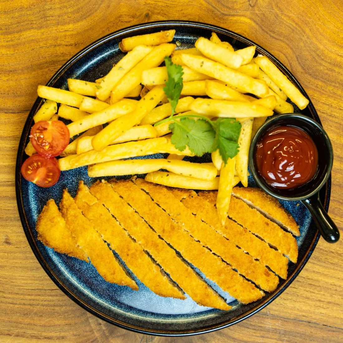 Картофель фри, курица, черри, томатный соус