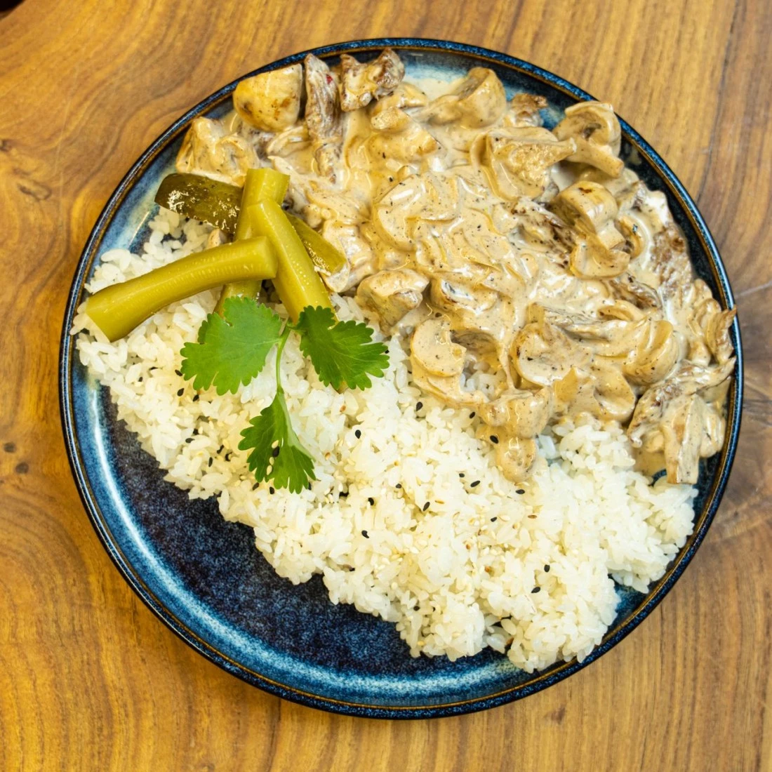 Говядина, рис, шампиньоны, лук, сливки, горчица, кинза, корнишоны