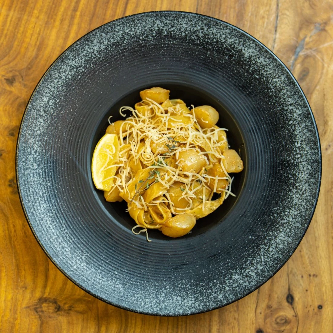 Гребешок, фетучини, соус устричный, сливки, тимьян, петрушка, пармезан