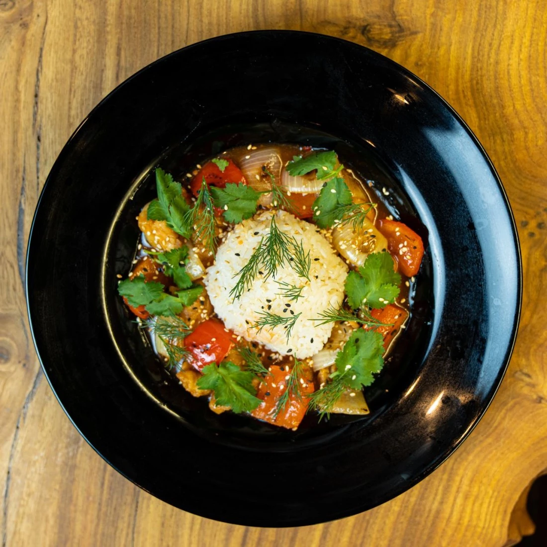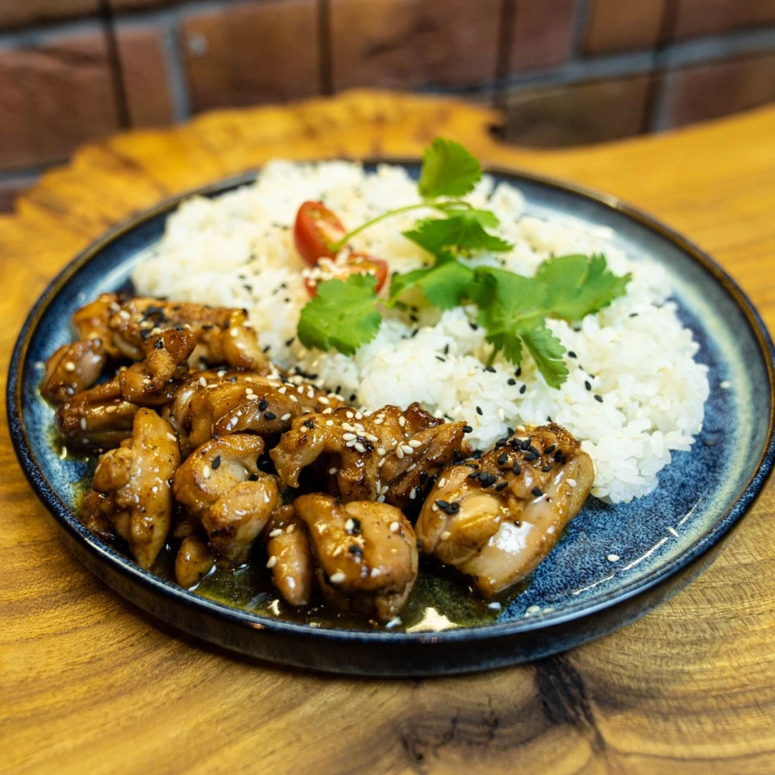 Цыпленок, рис, соус терияки, зелень, кунжут