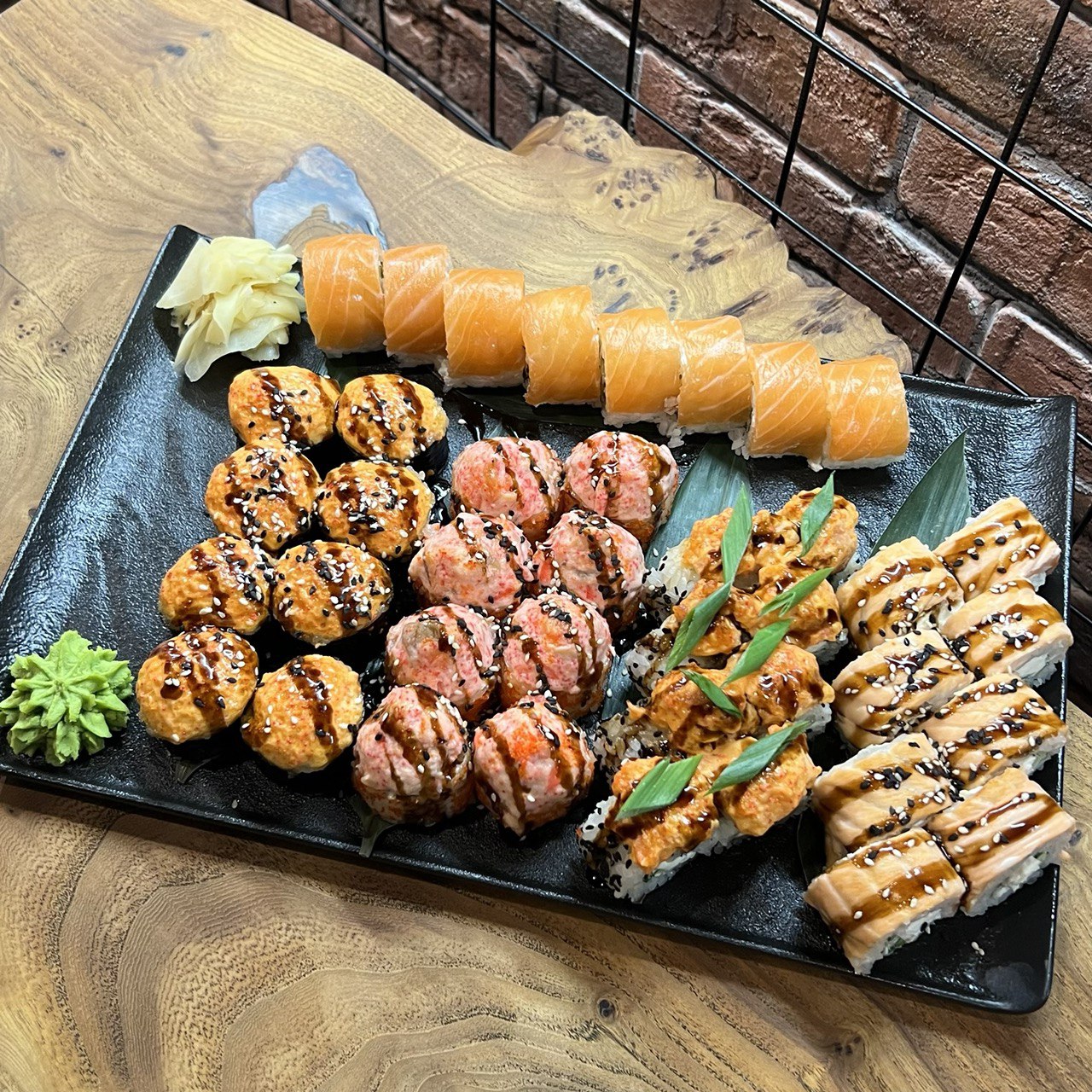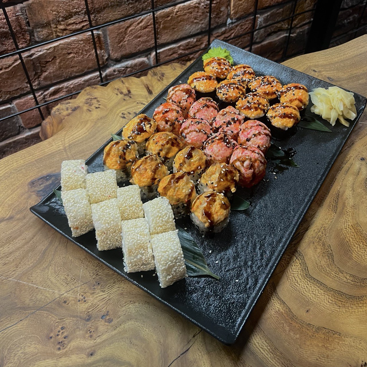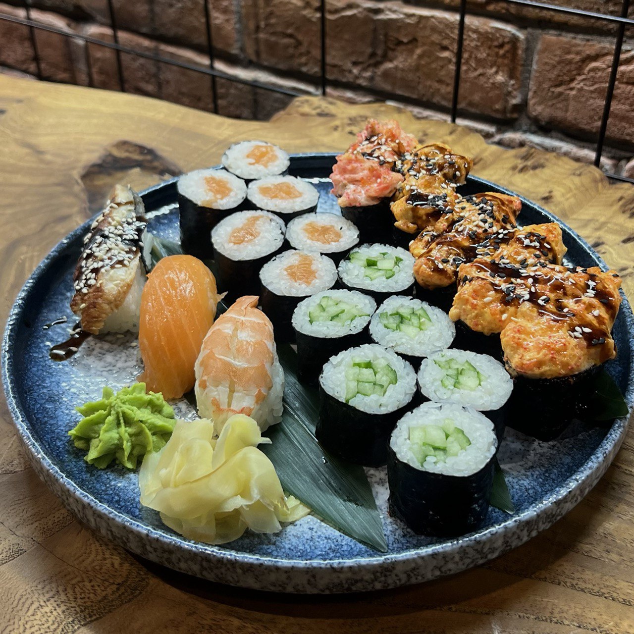 Нигири с лососем, нигири с угрем, нигири с креветкой, ролл "Сяке маки", ролл "Капа маки", запеченный гункан спайси угорь, запеченный гункан спайси гребешок, запеченный гункан спайси тунец, запеченный гункан сырный лосось