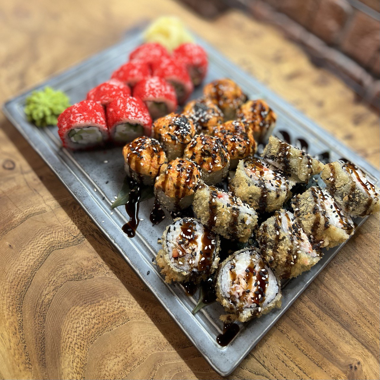 Ролл "Бекон темпура", ролл "Запечённый угорь", ролл "Калифорния"