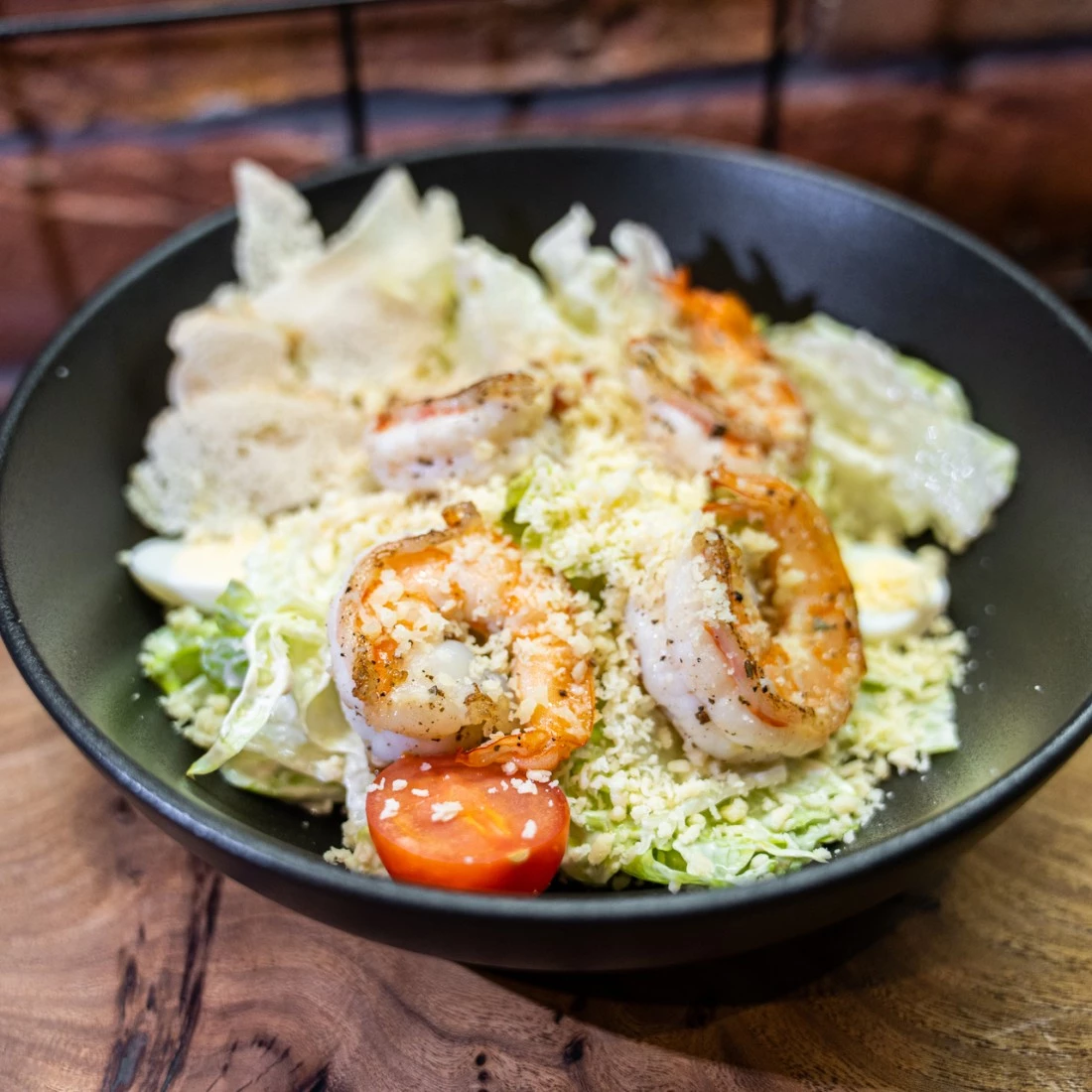 Тигровая креветка. листья салата, черри, перепелиное яйцо, пармезан, соус, крутоны