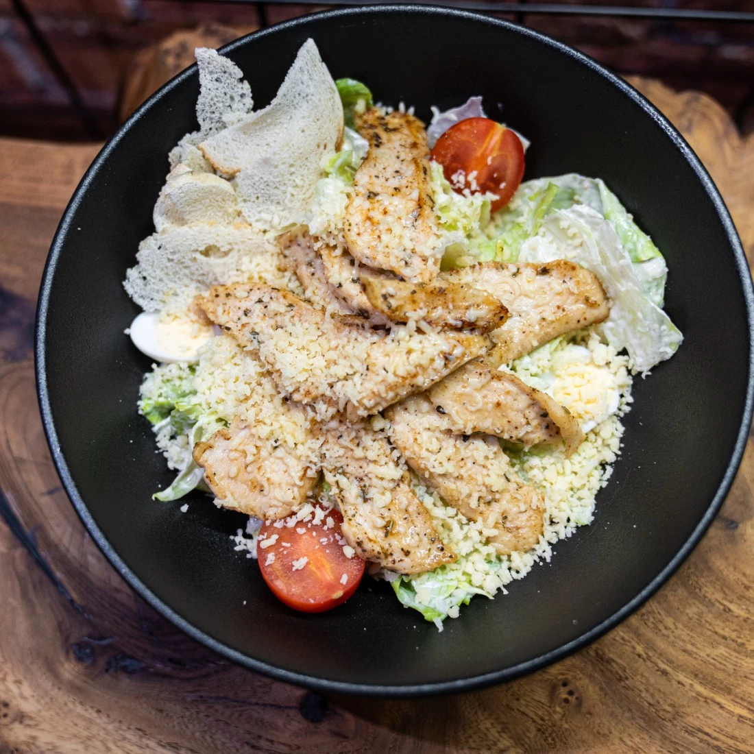 Цыпленок, листья салата, черри, перепелиное яйцо, пармезан, соус, крутоны
