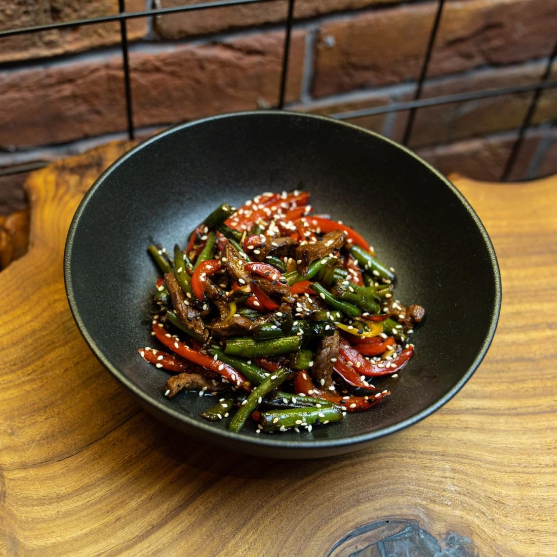 Говядиной, стручковая фасоль, болгарский перец, кунжут
