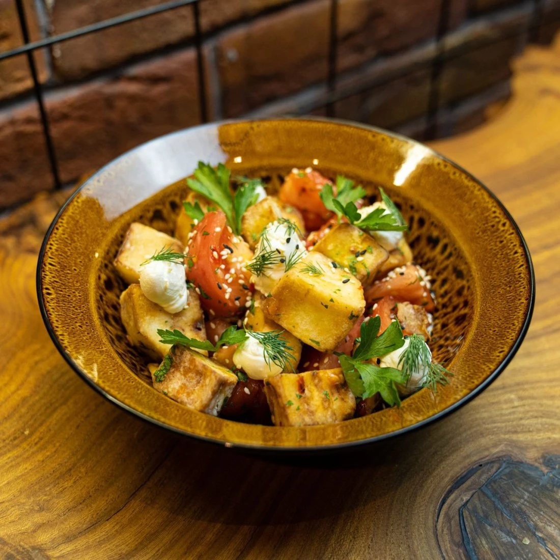 Баклажан, помидор, сливочный сыр, зелень, соус сладкий чили