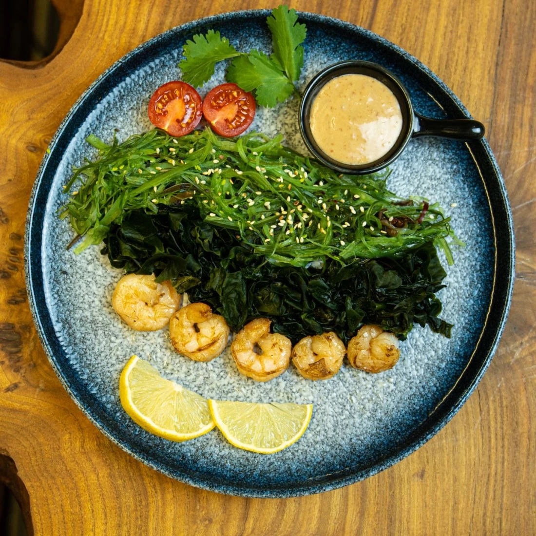 Водоросли чука, водоросли вакаме, креветки, черри, лимон, кинза, ореховый соус